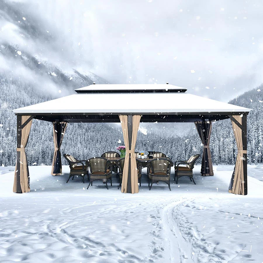 【Solide et Durable】 Le toit en acier galvanisé, résistant à la décoloration et à la rouille, bloque efficacement la lumière vive et les rayons UV nocifs. Sa structure robuste permet au gazebo de résister aux fortes chutes de neige, assurant ainsi une longévité optimale.